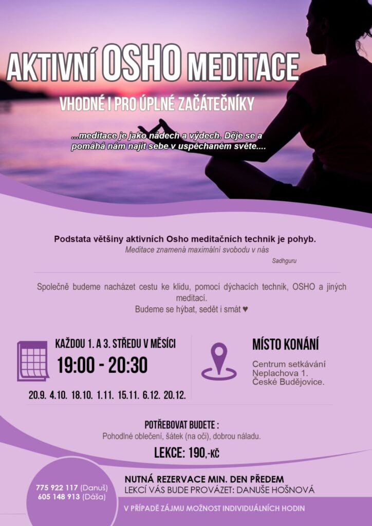 Při OSHO MEDITACÍCH zapojíme celé tělo, budeme se hodně hýbat (každý podle svých možností – meditace jsou i pro starší ročníky), budeme stát, sedět i ležet se zavřenýma očima i hledat ticho uvnitř své, myšlenkami často zahlcené hlavy.