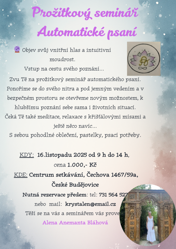 Zkus něco nového – zveme Tě na prožitkový dopolední seminář, doplněný meditací a relaxací s křišťálovými mísami… Lektorka ALENA ANEMANTA BLÁHOVÁ slibuje ještě něco navíc…více viz plakát…