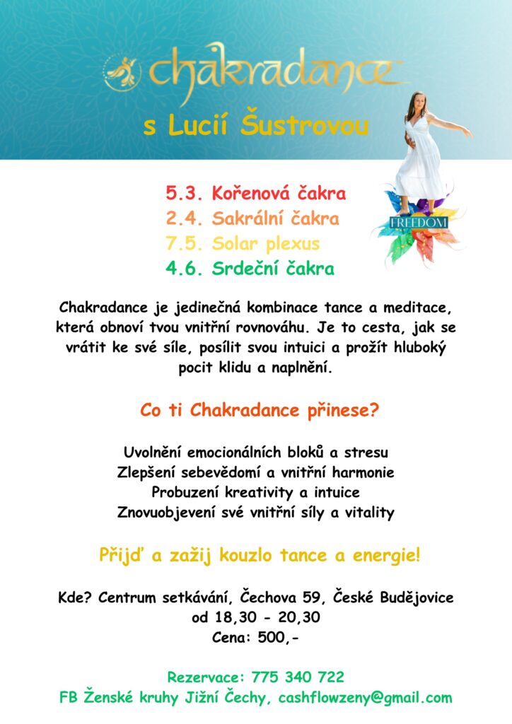 CHAKRADANCE je jemná a zároveň hluboká taneční terapie, která Tě povede do těla a do Tvého podvědomí. Jde o bezpečnou a laskavou techniku. Více viz leták…