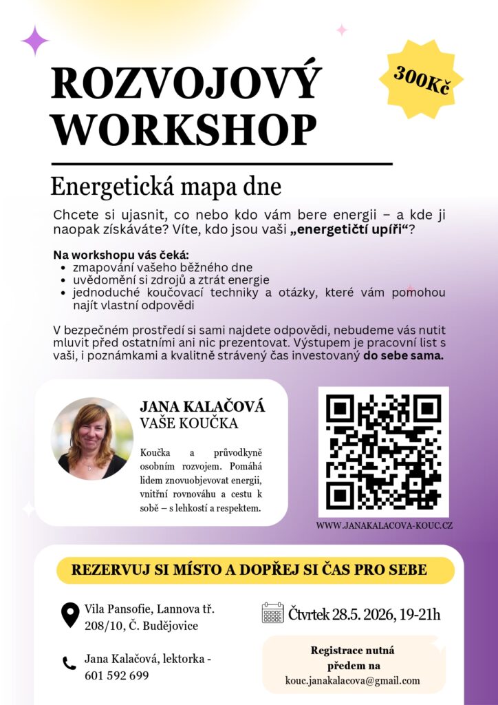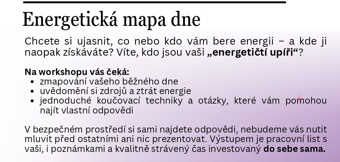 Pomocí jednoduchých cvičení, imaginací a koučovacích otázek si vytvoříš vlastní energetickou mapu dne – zmapuješ, co tě nabíjí, co nebo kdo tě oslabuje a jak malé změny v návycích mohou přinést víc klidu, rovnováhy i radosti do běžného dne.
