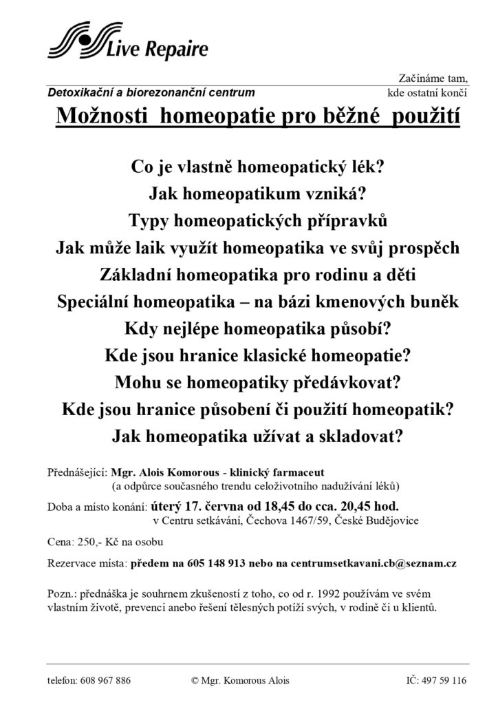 Přednášející: ©Mgr. ALOIS KOMOROUS klinický farmaceut, homeopat, terapeut Metody RUŠ, tel.na lektora: 608 967 886 . Můžete se objednat i na individuální konzultace.