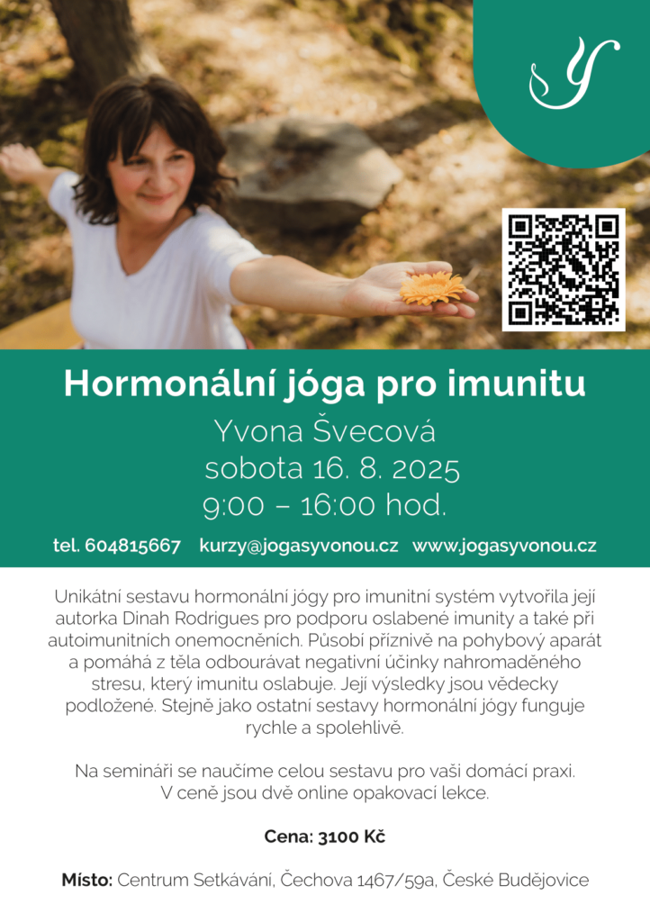 Rezervace před QR kód na letáčku nebo přes web lektorky: https://www.jogasyvonou.cz/akce-hormonalni-joga-pro-imunitu-2/