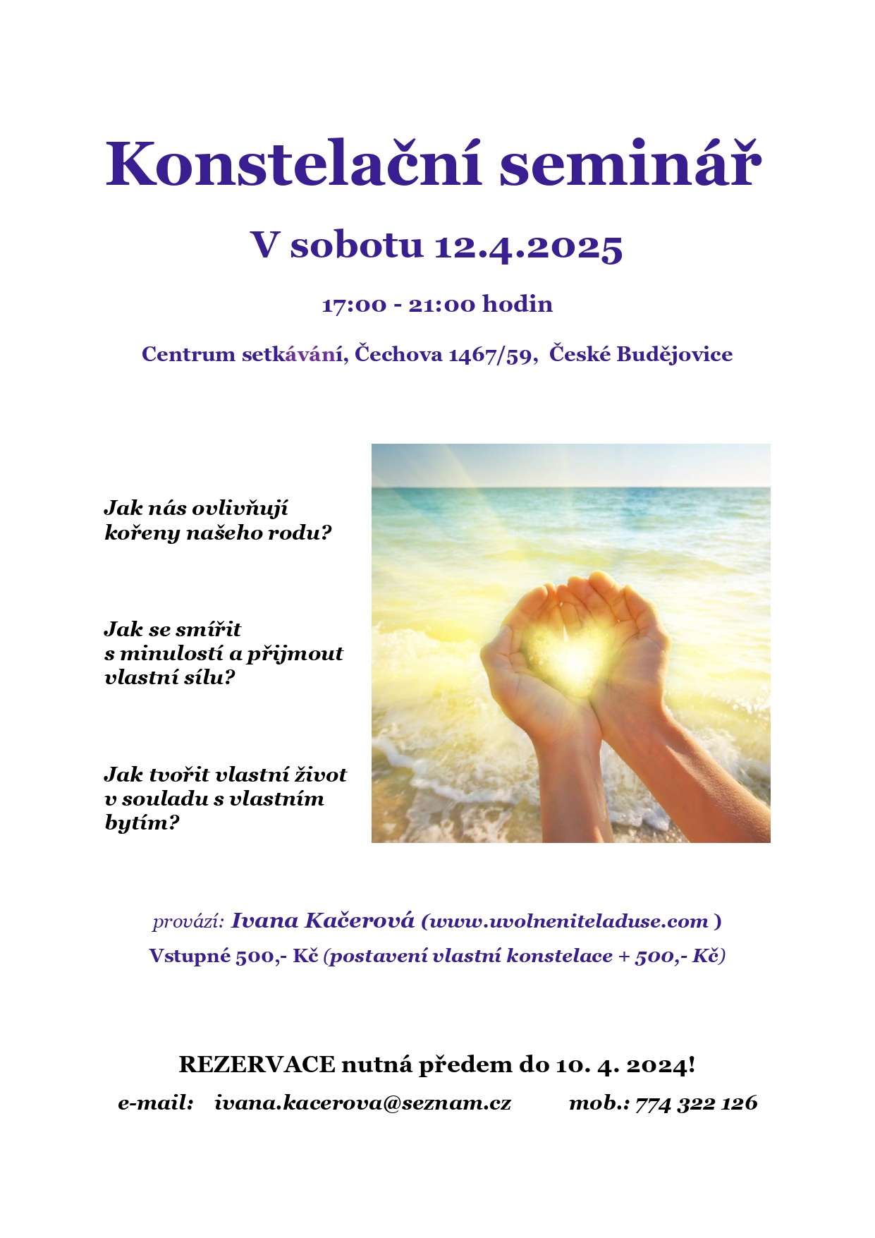 REZERVACE nutná předem do 10. dubna na e-mail: ivana.kacerova@seznam.cz nebo tel.: 774 322 126