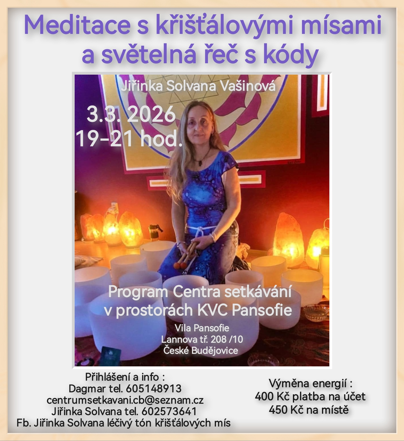 400Kč – 450KčSrdečně zveme na další jedinečné setkání s úžasnou Jiřinkou Solvanou a jejími křišťálovými mísami v propojení se světelným jazykem a zpěvem, kterým Jiřinka promlouvá mezi jednotlivými hraními na mísy. Tato velmi silná meditace s křišťálovými mísami je nádherným a nezapomenutelným zážitkem. Zvuk a vibrace křišťálových mís jsou hluboce léčivé a očistné.