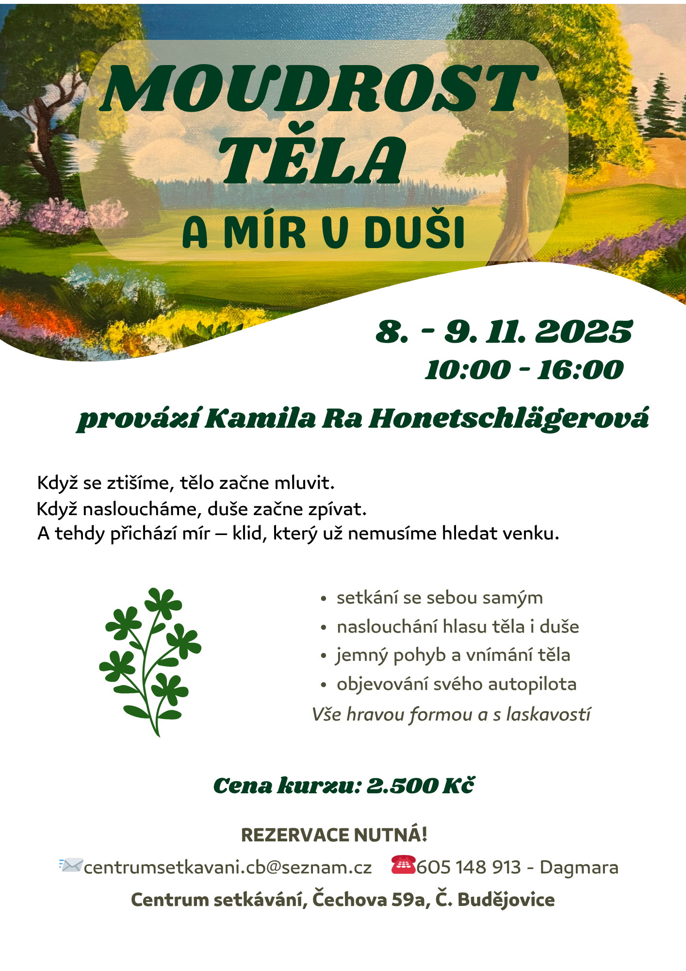 Provází: KAMILA RA HONETSCHLÄGEROVÁ, FB: Kamila Honetschlágerová Vycházím především ze svých prožitých zkušeností a integrace. Přes 30 let praxe v oblasti lidského zdraví celostním pohledem mi neustále ukazuje cestu jedinou. Nikdo Vám neukáže a nesdělí, co je pro vás to nejlepší. Žádný guru. Nejlepším terapeutem, nejdůležitějším elementem, poradcem je inteligence těla, moudrost nitra, srdce.