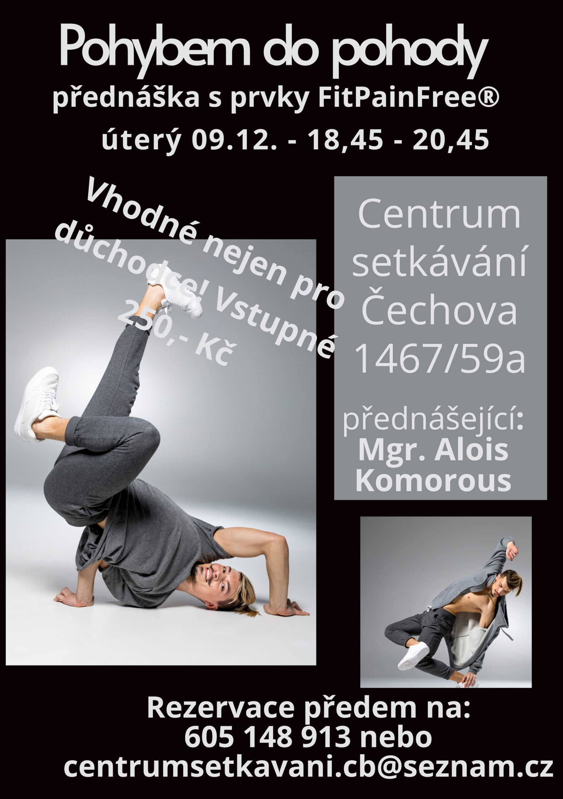 V tomto roce poslední, zato úplně nová přednáška Mgr. Aloise Komorouse. A to o cvičení, které opravdu pomáhá – pro ženy i muže, pro mladé i důchodce… Seznamte s FitPainFree® !