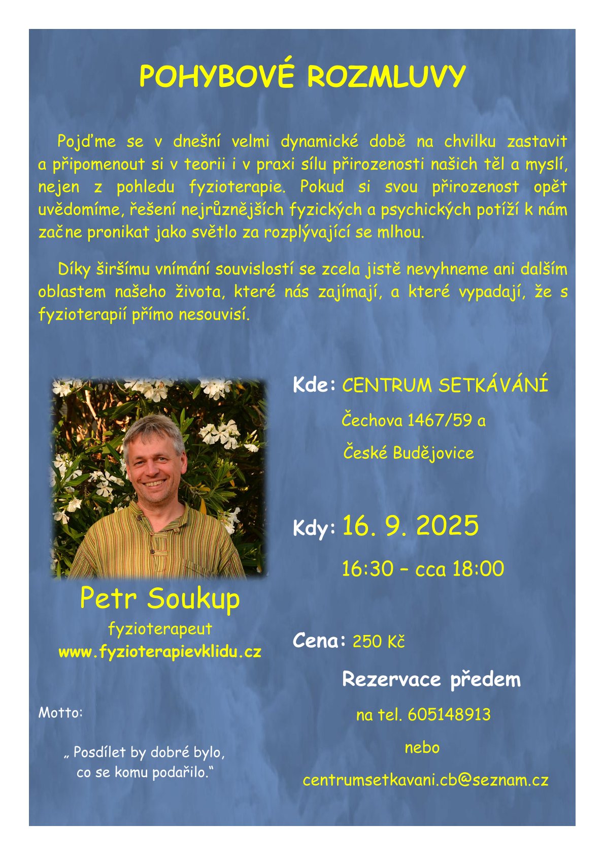 Přijďte si poslechnout fyzioterapeuta Petra Soukupa, který vnímá sílu přirozenosti a provázanost těla a mysli a případně posdílet i své zkušenosti…
