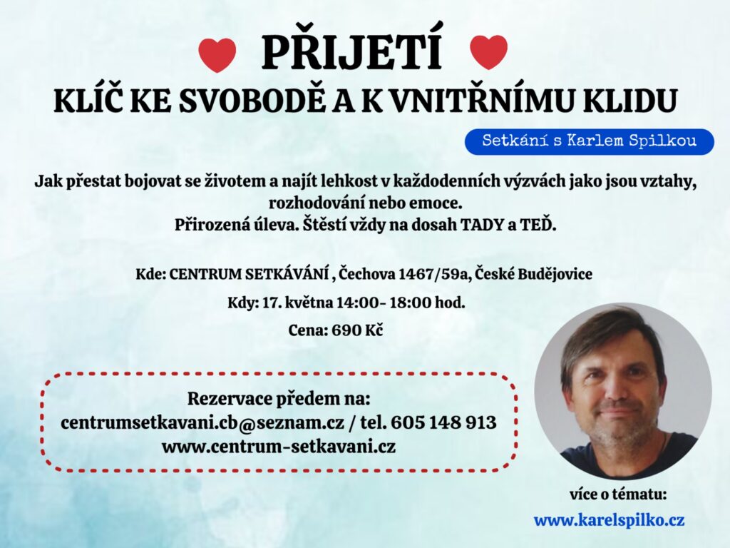 Toto setkání s Karlem Spilkou bude hlubokým ponorem do přijetí reality takové, jaká je. Přijetí není pasivita ani rezignace – je to naopak stav, ve kterém se objevuje skutečná svoboda.