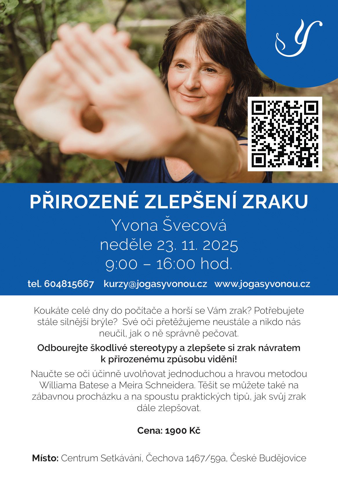 Na tomto kurzu se naučíte, jak oči účinně uvolňovat jednoduchou a hravou metodou Williama Batese a Meira Schneidera, která pracuje se všemi částmi zrakového systému. Naučíte se i relaxační techniky, tzv. zábavnou procházku, dostanete spoustu praktických tipů, jak svůj zrak zlepšovat…