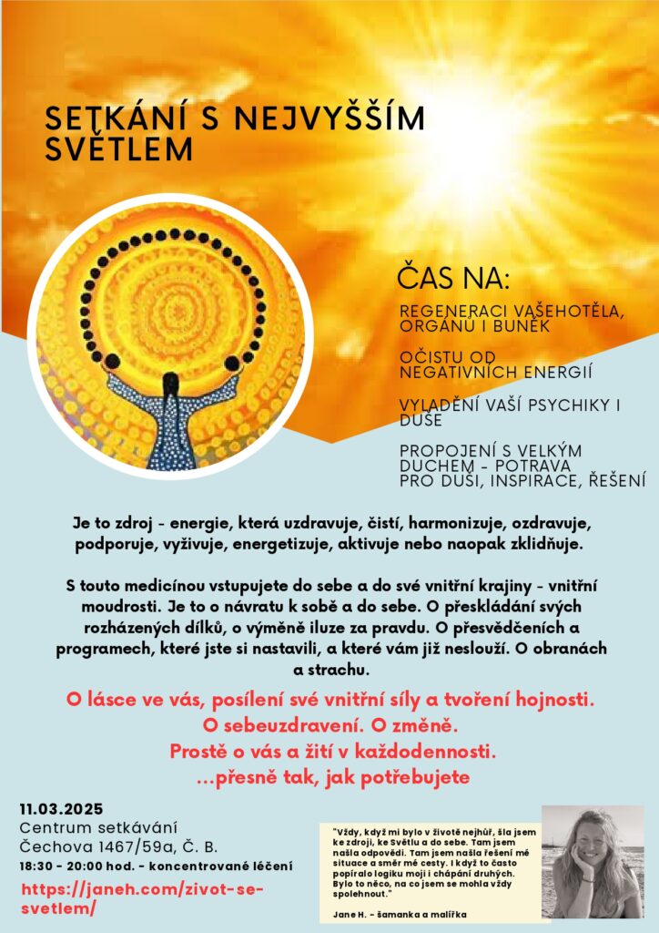PŘIHLÁŠENÍ na: https://janeh.com/zivot-se-svetlem/ nebo na tel. 777 887 168, příp. mail: jane@janeh.com