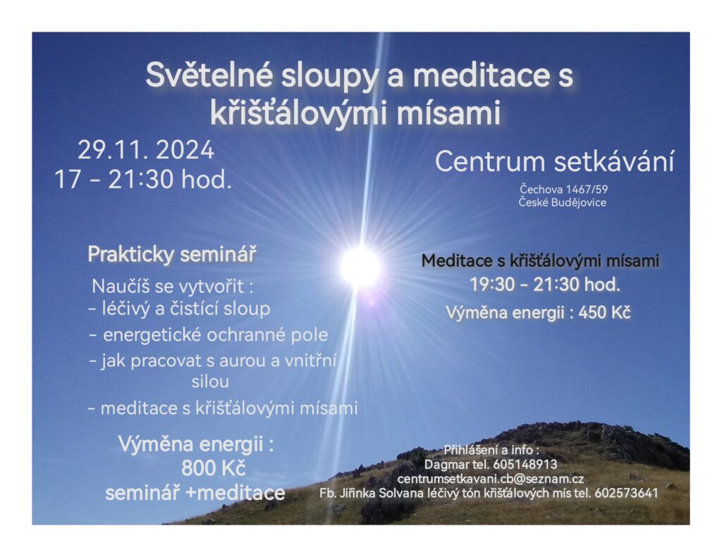 Na seminář navazuje od 19:30 hod. meditace s křišťálovými mísami a světelná řeč s kódy. Můžete přijít pouze na večerní meditaci…