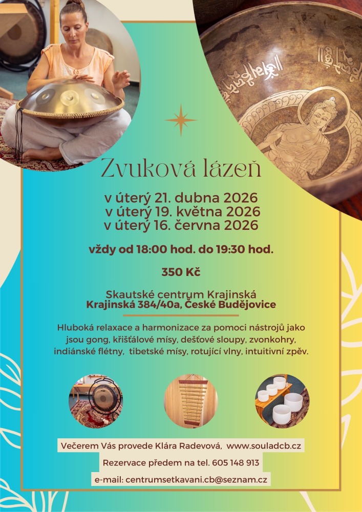 Zvuková lázeň je terapeutická a relaxační metoda, využívající zvuků a vibrací hudebních nástrojů k dosažení hlubokého uvolnění a harmonie. Účastníci zvukové lázně leží pohodlně na karimatkách a nechávají se obklopit zvukovými vlnami, které působí na všechny složky jejich bytosti – tělo, mysl i duši. Tato metoda pomáhá snížit stres, podpořit regeneraci a navodit meditativní stav.